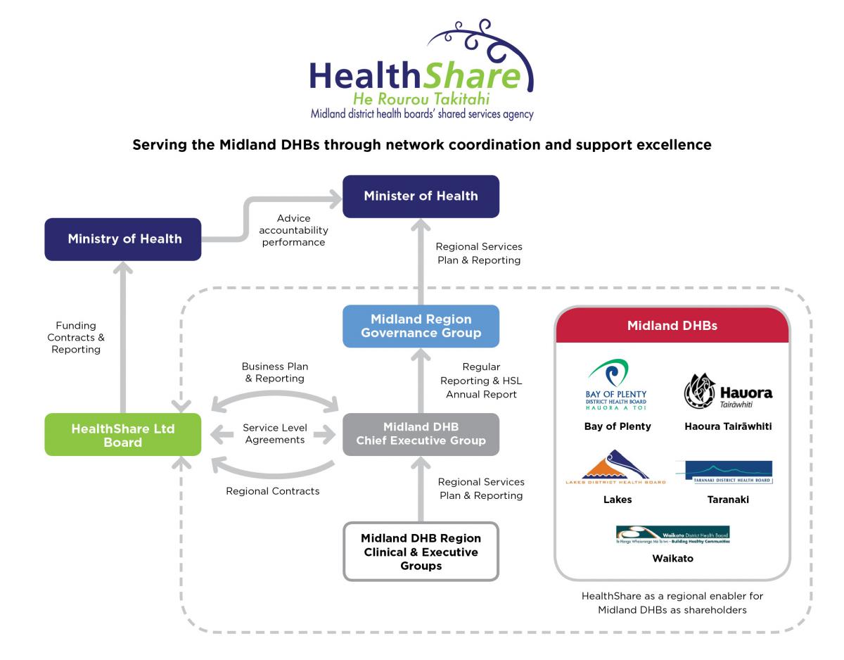 HealthShare has a five-member Board of Directors comprising the chief executive of each of the equal shareholding Midland District Health Boards. The Board of Directors has oversight of the strategic direction of HealthShare activities, including: